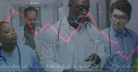 Examining medical professionals reviewing patient file in hospital corridor, red financial charts. Healthcare, collaboration, modern, diagnostics, professionalism, data, analytics