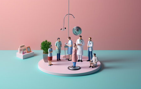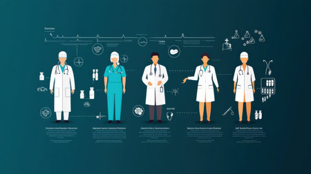 A diverse team of healthcare professionals in a modern hospital environment, surrounded by digital medical icons and technology, symbolizing innovation and collaborative care. Perfect for medical and health industry visuals.