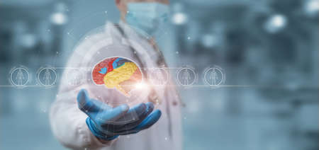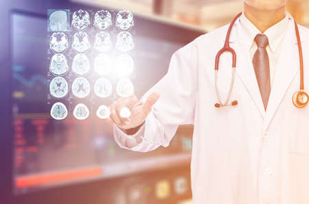 Doctor, Surgeon, Checking brain patient testing result with digital holographic interface, Futuristic of medical, Innovative technology in science and medicine concept.