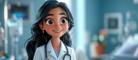 Female doctor with stethoscope in hospital ward. 3d rendering