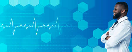 Genetic engineering concept. Collage with black male doctor and DNA helix over blue background, copy space. Panorama