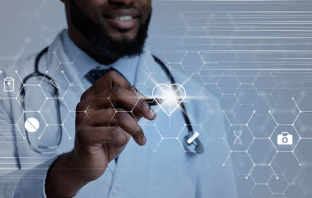 African American male therapist drawing heart icon on invisible touchscreen, collage with free space