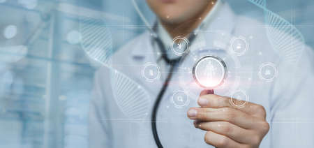 Medicine doctor hand with stethoscope working with icon medical treatment on virtual screen interface computer.