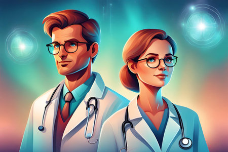 Team of doctors with stethoscopes on futuristic background. Vector illustration