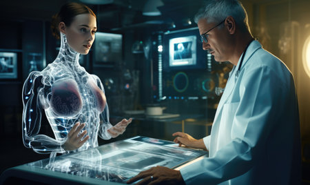 Advanced e-health app displaying a human anatomy interface on a smartphone, with medical tools nearby