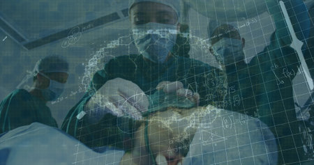 Image of scientific data processing over diverse surgeons in hospital. Global medicine, science, data processing and digital interface concept digitally generated image.