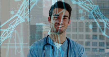 Image of data processing over caucasian male doctor smiling. Medicine and digital interface concept digitally generated image.