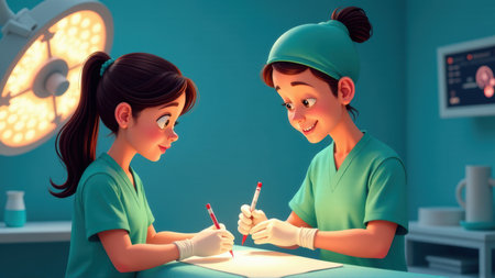 Two Cartoon Surgeons Drawing Plans Together in Operating Room, generative Ai