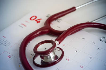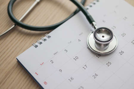 Stethoscope with calendar page date on wood table background doctor appointment medical concept