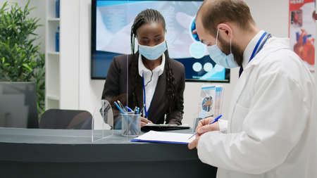 Doctor and receptionist talking about appointment at hospital reception desk, preparing to attend checkup examination during coronavirus pandemic. People working at medical facility.