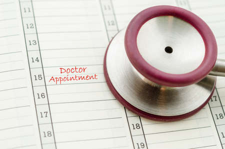 A scheduled doctors appointment is wrote on a calendar for a patient with stethoscope.