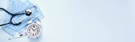 Stethoscope, thermometer, syringe and alarm clock on a bright blue background. Accessories and medical aids. Health care concept. Banner size. Copy space