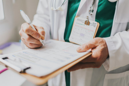 A healthcare professional, possibly a doctor, writing on a clipboard, suggesting the act of taking notes or updating a patient's medical records