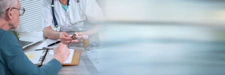 Female doctor explaining medicine to her patient in medical office; panoramic banner