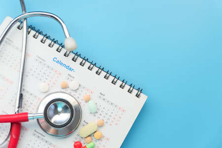 Top view of stethoscope and calendar on the brown background, schedule to check up healthy concept