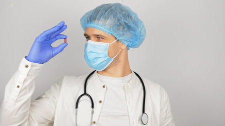 A young handsome doctor in a medical mask holds a red pill in his hands presenting a new drug.A young doctor shows a new drug at the presentation, a red pill for all diseases.
