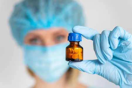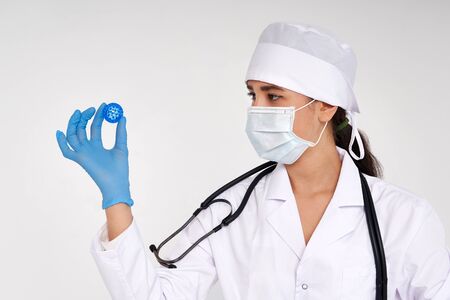 Young attractive female hurse or doctor with gloves and mask holding a pill in hand. Medicine concept