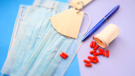Blurred view Protective face masks, red pills against virus , notepad, pen, Selective focus, shallow depth of field and blur vignette;