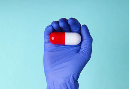 Medic's hand in latex gloves holds capsule on blue background. Medical concept