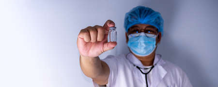 Portrait of a doctor wearing a mask and wearing a hat Stand holding an empty vaccine or pill bottle.Medical concept and treatment.