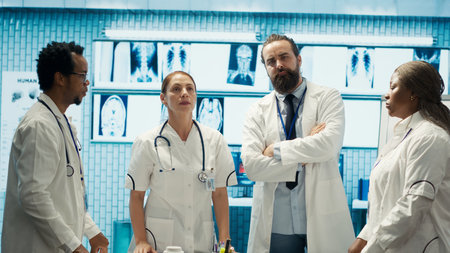 Group of medical staff discussing in hospital meeting room about patient radiography. Clinic expert therapist talking with colleagues about disease, medicine professional