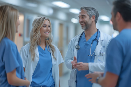 Diverse team of doctors and nurses in scrubs smiling and interacting in a modern hospital environment.