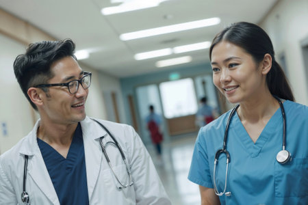 Portrait of happy two Asian doctors are smiling at each other in a hospital hallway, scene is friendly and positive