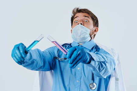 Man with a beard on a white isolated background holds test tubes for experiments, science, scientist, doctor.