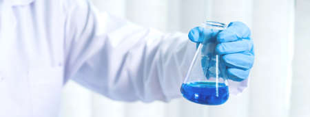 hand of scientist holding flask with lab glassware and test tubes in chemical laboratory background, science laboratory research and development concept