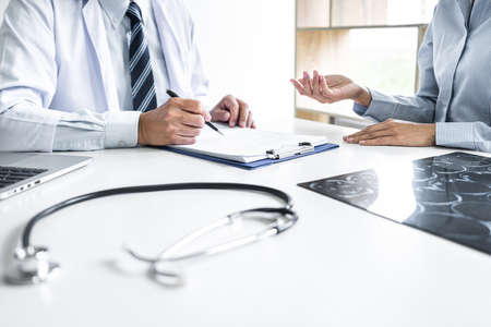 Professor Doctor consulting with patient discussing something and recommend treatment methods, Presenting results on report and x-ray film, Medicine and health care concept.