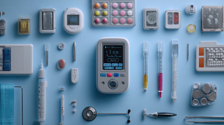 An organized collection of medical equipment, including syringes, vials, and a monitoring device, displayed on a light blue background for healthcare themes.