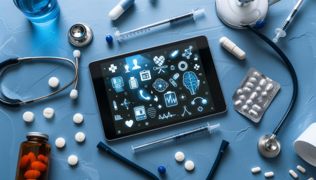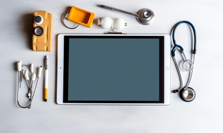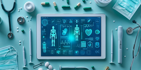 Digital medical interface on tablet surrounded by various healthcare tools and medications.