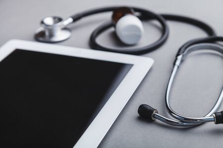 Tablet with medical objects on a desk as a metaphor for electronic diagnostic or healthcare mobile apps. Medical background