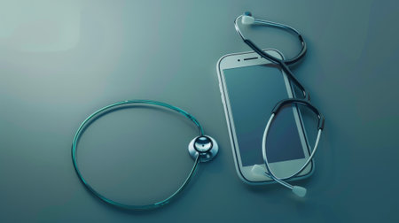 This graphic shows a realistic smart device with a stethoscope attached to the screen as a concept of electronic health or e-health