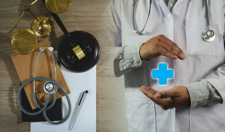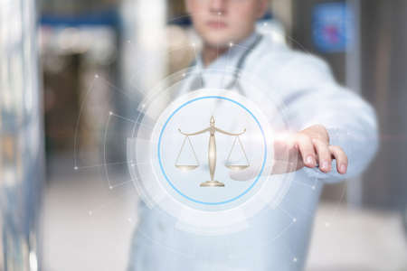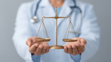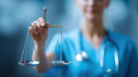 A medical professional demonstrating the balance between justice and ethics by holding balance scales. This image represents the harmony of healthcare and legal principles.