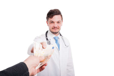 Patient paying the doctor services as high cost of healthcare concept isolated on white with advertising area