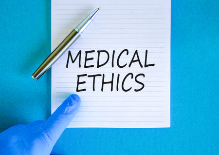 Medical ethics symbol. Concept words Medical ethics on beautiful white paper. Doctor's hand in blue glove. Beautiful blue background. Medical healthy lifestyle medical ethics concept.