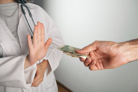 Concept of medical ethics, bound hands. Doctor holds a stethoscope and a banknote of US dollars.