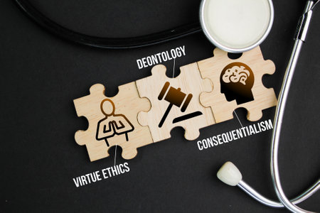 stethoscope and wooden puzzle with icons and the words virtue ethics, deontology, and consequentialis. What are the three normative ethics