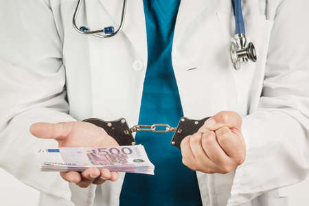 Doctor with a stethoscope and euro-banknotes and handcuffs. Crime