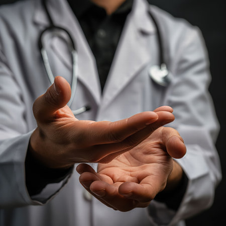 A close-up captures a medical professional in a lab coat and stethoscope. The image showcases the subject's face, curly hair, and the details of the uniform against a dark background. It conveys a sense of expertise and care, suitable for medical publications and healthcare-related advertising.