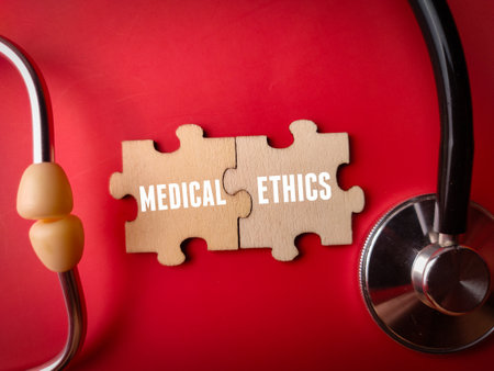Stethoscope and wooden puzzle with the word MEDICAL ETHICS on a red background.