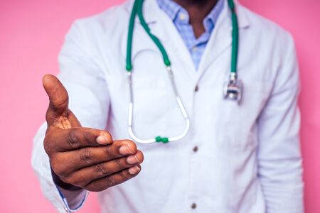 happy male african medical surgeon cardiologist doctor in a white coat holding out a hand for a handshake on a pink background in the studio.Welcome invitation gesture.