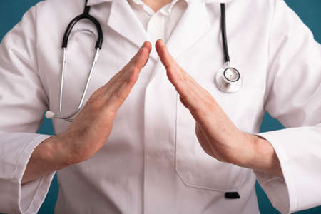 A doctor in medical gloves crossed his arms with a gesture of failure. The concept of ending the epidemic and removing quarantine - stay home