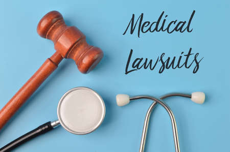 Judge gavel and stethoscope with text MEDICAL LAWSUITS.