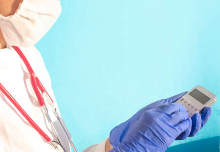 A doctor in rubber gloves on a blue background holds a stethophonendoscope.