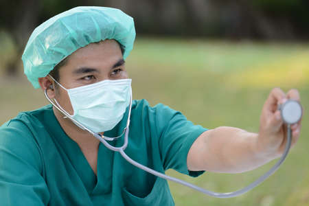 Portrait of Asian medical doctor using stethoscope on the green park background