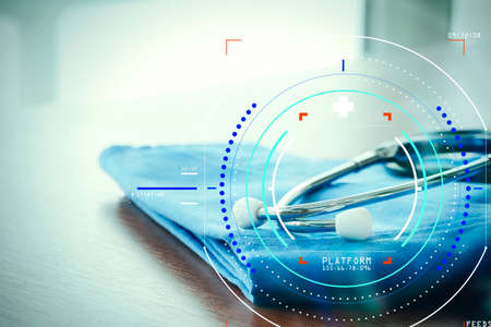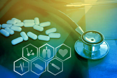 Accurate diagnosis appropriate treatment medical concept.Doctor hand working with stethoscope and laptop computer digital tablet with virtual dashboard interface
