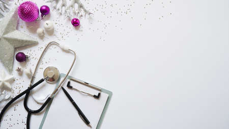 Christmas medical banner christmas decor white stars, purple balls, snowflakes, stethoscope and tablet on white background top view. Copyspace. Medicine new year flatly. Doctor writes down the text.