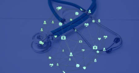 Digital composite image of Globe of green medical icons over stethoscope against white background. Medicine research science concept